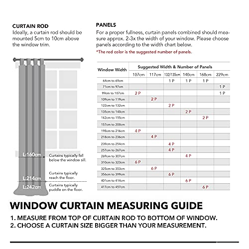DIMENSIONI E MONTAGGIO - Ciascuno misura 140x175 cm( larghezza x altezza ). L'altezza è misurata dalla parte superiore del tessuto. Quantità: 2 pezzi per confezione. Queste tende di altissima qualità sono disponibili in un'ampia varietà di dimensioni e sono vendute in 2 pezzi per confezione. Il montaggio e la manutenzione sono molto semplici, ogni tenda ha 7 passanti, semplicemente appeso direttamente sull'asta della tenda.
