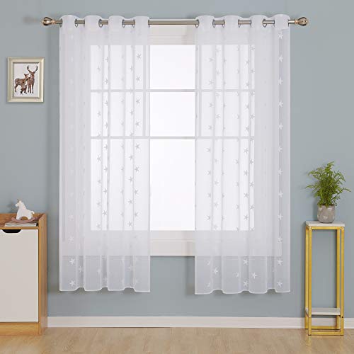 Deconovo Tende Trasparenti Voile con Occhielli per Soggiorno Moderne con Grandi Stelle Bianche Ricamate 140x175 CM 2 Pannelli