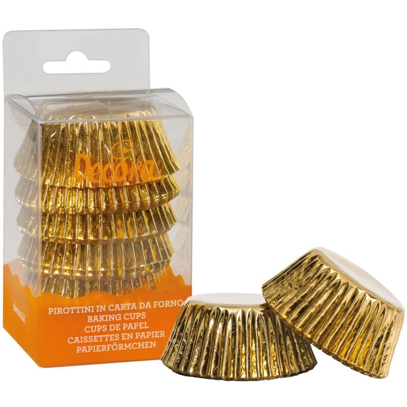 Descrizione In carta alimentare antiaderente da forno, resistente fino a 220°. Disegnati, a pois, monocromatici, a righe: tante fantasie per ogni abbinamento. Contenuto della confezione 60 Pirottini Oro 50 X 32 Mm