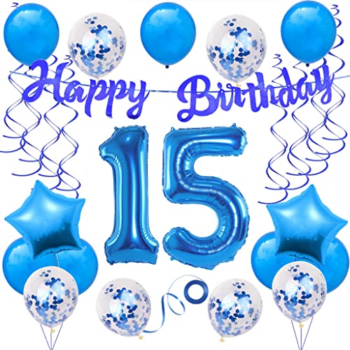 15° festa di compleanno, colore blu: inclusi palloncini in pellicola digitale da 32 pollici + festone Happy Birthday + 7 palloncini in lattice + 6 palloncini coriandoli + 2 palloncini a forma di cuore (18 pollici) + 6 decorazioni da appendere + nastri