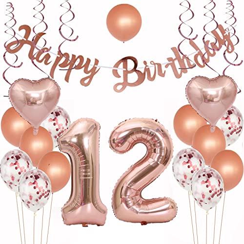 Decorazione di compleanno per 12 anni, in oro rosa, 12° compleanno, per ragazze, donne, palloncini per 12° compleanno, festone Happy Birthday, numero gigante 12 palloncini in pellicola