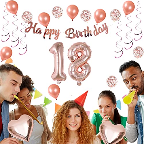 18° festa di compleanno: inclusi palloncini in pellicola digitale "18" da 32 pollici + festone Happy Birthday + 7 palloncini in lattice + 6 palloncini + 2 palloncini a forma di cuore (18 pollici) + 6 decorazioni da appendere + nastri