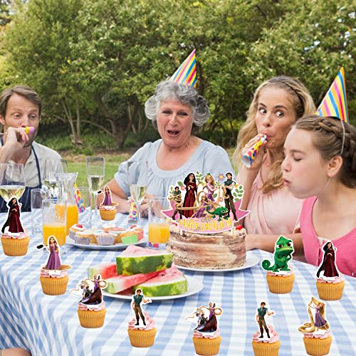 【Decorazione compleanno Rapunzel】: Set da 32 pezzi per la festa di Rapunzel. 12 pezzi di decorazioni per cupcake e 1 pezzo di decorazione per torta grande, 1 striscione di compleanno, 18 palloncini (6 rosa, 6 gialli e 6 viola chiaro). Perfetto per le decorazioni di una festa da principessa.