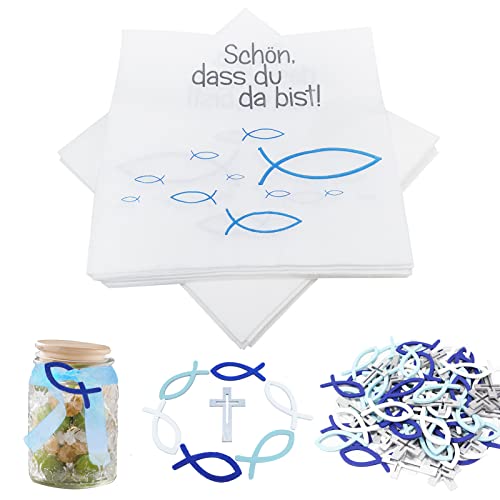 Bellissimi e di alta qualità: tovaglioli per comunione in cellulosa di alta qualità, struttura a 3 strati, lisci e ordinati, morbidi e confortevoli, assorbenti e resistenti agli strappi. I tovaglioli sono con la scritta "Schön, dass du da bist! "Stampato, squisito motivo di piccoli pesci, crea un'atmosfera adeguata per una comunione e lascia brillare la tua decorazione da tavolo