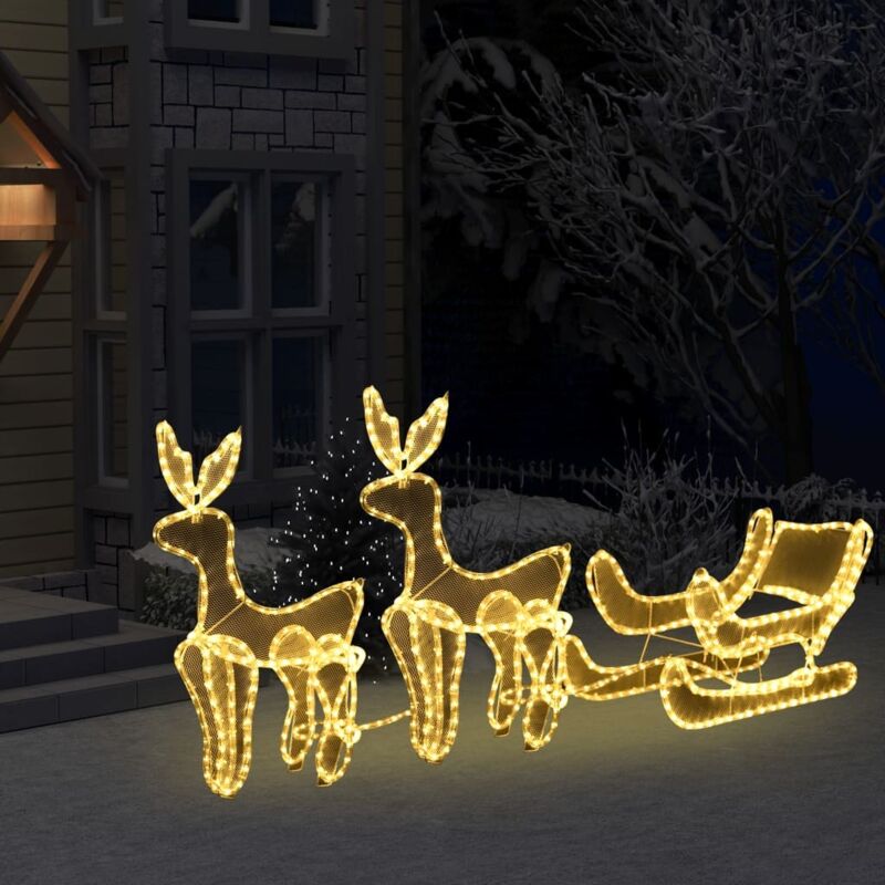 Questa accattivante decorazione luminosa con luci natalizie a forma di 2 renne e slitta, inclusi LED e rete, è una decorazione perfetta. La decorazione è realizzata in PVC e ha un telaio in acciaio, che la rende resistente agli agenti atmosferici e durevole. Le luci creano luci scintillanti che brillano dolcemente nella notte, aggiungendo un'aria di eleganza al display. Questa adorabile decorazione natalizia è resistente all'acqua e quindi adatta sia per interni che per esterni. È senza dubbio un ottimo regalo per la vostra famiglia e amici per il prossimo Natale. Nota: nella consegna è inclusa una spina. Per la sicurezza, utilizzare il cavo della luce solo in combinazione con l' Interruttore differenziale /Interruttore di corrente residua (non incluso). Colore luce: Bianco caldo Materiale: PVC, acciaio Dimensioni complessive: 200 x 65 cm (L x A) Dimensioni della renna: 40 x 24 x 65 cm (L x P x A) Dimensioni della slitta: 55 x 30 x 35 cm (L x P x A) Lunghezza del cavo: 1,5 m Lunghezza
