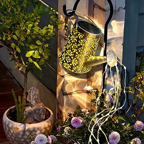 Design a forma di annaffiatoio: 50 perline di lampada a energia solare a forma di bollitore, striscia luminosa sospesa lunga 96 cm. La luce gialla calda si riflette sul terreno e sul prato attraverso la piastra di metallo intagliata cava, illuminando il vostro giardino delle favole