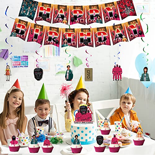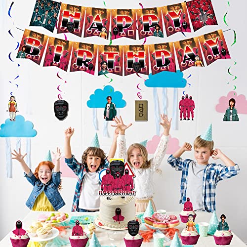 Decorazione per torta "Happy birthday", 32 pezzi Squid game decorazioni di compleanno include 1 striscione, 24 topper per cupcake, 6 decorazioni a forma di girelle da appendere, 1 cake tropper per Squid Game.
