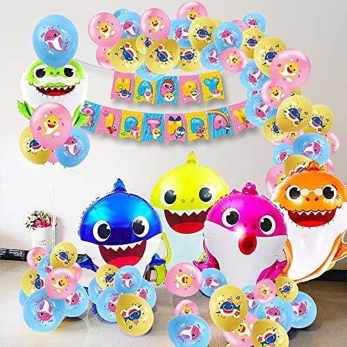 Decorazioni di compleanno per Famiglia di Squalo, Forniture per Feste a Tema Dell'oceano, Buon Compleanno Striscione Palloncini con Stampa Foil Cake Toppers Cupcake Adesivi per Baby Doccia
