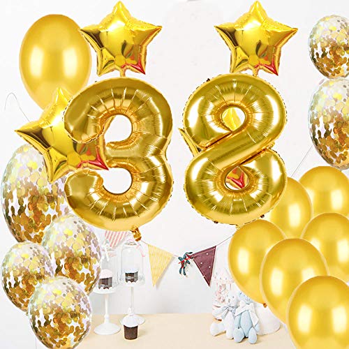 Il pacchetto include: 100 pollici di palloncini in lamina d'oro "38", 16" "Happy Birthday day", 4 palloncini a stella in mylar da 45,7 cm, 5 palloncini coriandoli e 20 palloncini in lattice dorato