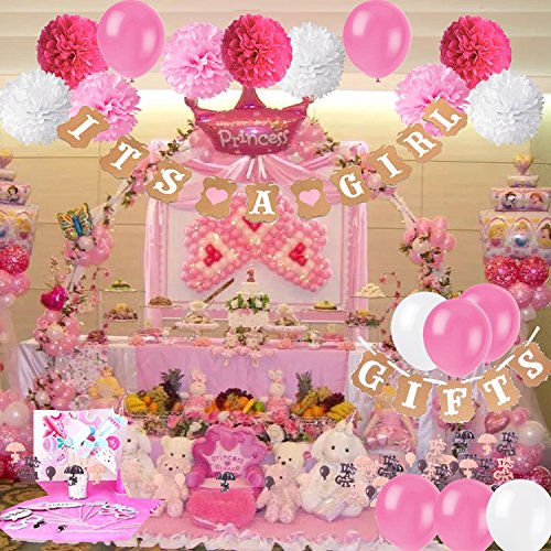 All-In-One Baby Shower Set di decorazioni - 1pcs IT'S A GIRL Banner, 1pcs GIFTS Banners, 1pcs Mommy to Be Sash, 9pz Pom Pom in carta e 20pz Palloncini Party, 25pz Carino Photo Booth Puntelli, Baby Shower Coriandoli per ragazzi.