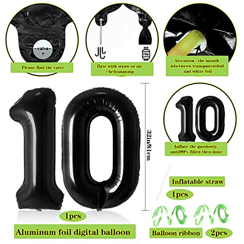 ★Video Game Party Balloons: palloncino in alluminio digitale nero "10" (32 pollici), 18 palloncini in lattice (6 frutti verdi, 6 neri, 6 verdi), 10 palloncini stampati (5 verdi, 5 neri), 2 stelle nere, 2 palloncini in alluminio per gamepad, 1 banner a tema di gioco, 2 nastri verdi