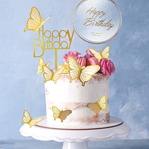 【Pacchetto Include】: 20 decorazioni per torta a farfalla beige, con 4 misure, 3,43 x 2,48 pollici, 2,68 x 1,89 pollici, 2,56 x 1,77 pollici, 1,97 x 1,42 pollici. 1 piastra rotonda in acrilico con cornice in metallo dorato, topper per torta di compleanno e 1 topper per torta in acrilico Happy Birthday.
