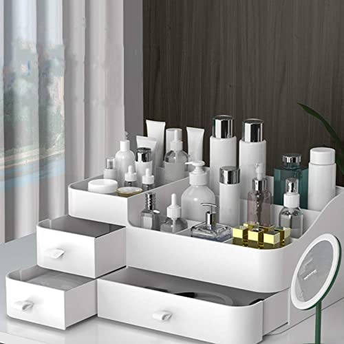 [TROVA FACILMENTE QUELLO DI CUI HAI BISOGNO]: 1 cassetto grande e 2 cassetti piccoli, che possono essere utilizzati per riporre maschere facciali o borse per cosmetici e piccoli oggetti. Ci sono 8 scomparti superiori per piccole collezioni quotidiane come crema idratante, lozione, rossetto, smalto per unghie, pennello per il trucco, eyeliner, vassoio per ombretti, ecc. Tutto può essere organizzato in ordine, permettendoti di trovare rapidamente ciò di cui hai bisogno. È la toeletta perfetta.