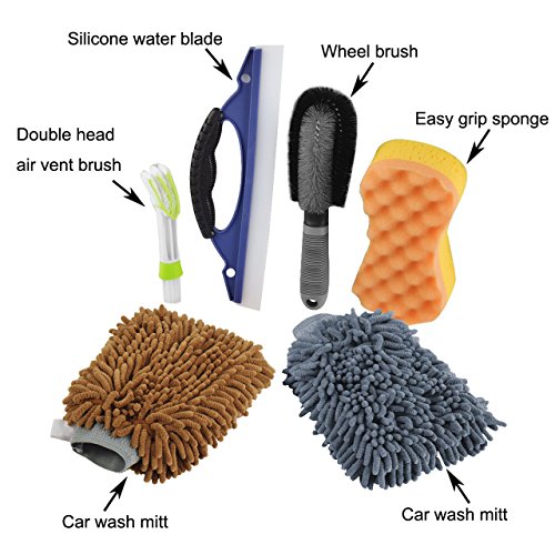 Perfetto 7 pack kit per lavaggio auto: La confezione include 1*Doppia testa spazzola per pulizia dell'uscita di aria condizionata, 1*Autolavaggio guanto, 1*Spugna per pulizia auto, 1*Spazzola di ruota per auto, 1*Raschietto Acqua, 1*Contenitore di plastica(usato anche come secchio d'acqua) risparmiando spazio per la sua auto o casa.
