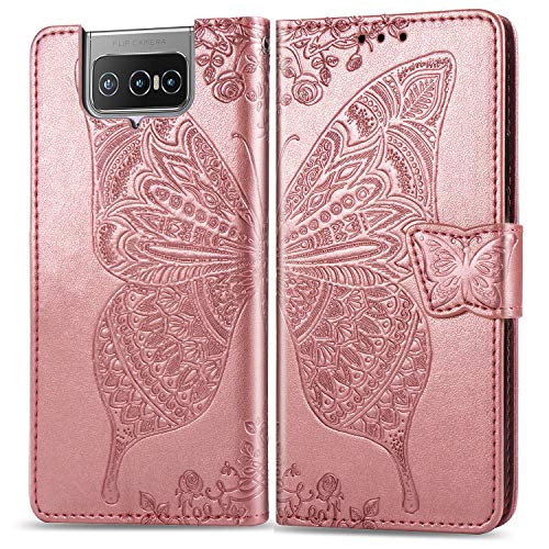 Dedux Portafoglio Custodia per ASUS Zenfone 7 ZS670KS, Cover per Custodia a Farfalla con Fiore di Rosa in Rilievo [Funzione Stand] [Slot Cart] [Chiusura Magnetica], Dotata di Cordino. Oro Rosa
