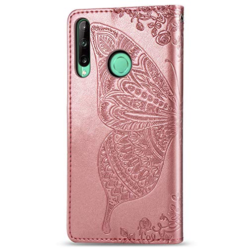 Dedux Portafoglio Custodia per Huawei Y7p/P40 Lite E, Cover per Custodia a Farfalla con Fiore di Rosa in Rilievo [Funzione Stand] [Slot Cart] [Chiusura Magnetica], Dotata di Cordino. Oro Rosa