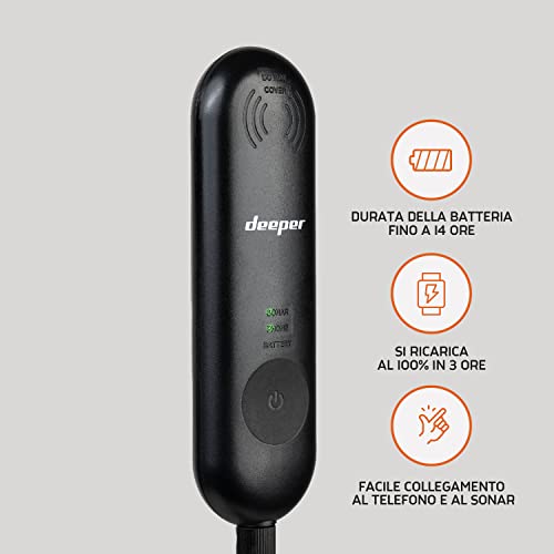 DURATA DELLA BATTERIA FINO A 14 ORE: non sono richiesti fili o trasduttori. Il Deeper Range Extender si ricarica al 100% in sole 3 ore.