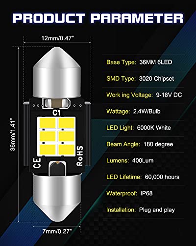 【Specifiche】: (6 lampadine LED da 36 mm) - (Tensione di ingresso: 9-18 V CC) - (Potenza: 2,4 Watt) - (Colore: bianco 6000 K) - (Flusso luminoso: 400 Lum) - (Angolo del fascio: 180 gradi) - (Dimensioni: 36 mm/1,41 "* 7 mm/0,27"). La nuova tecnologia LED e le luci bianche brillanti donano all'auto un aspetto nuovo.
