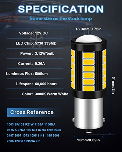 【Specifica】 4pcs 1156 5730 33-SMD Lidurbull, Lunghezza: 2,0 ”51 mm, diametro: 0,72” 18,3 mm, 3000k Luce bianca calda, 500 libbre per lampadina, tensione: 12 V DC, Wattaggio: 3,12W. Ogni lampadina ha 33 patatine LED 5630 ad alta potenza.