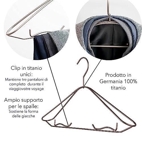 INCLUDE UN INNOVATIVO APPENDIABITI IN TITANIO - L'appendiabiti è realizzato al 100% in titanio in Germania per renderlo leggero e resistente. Le ampie spalline consentono di appendere fino a 3 abiti su una sola gruccia. Gli esclusivi fermagli in titanio possono contenere fino a tre pantaloni o gonne. In questo modo, anche i pantaloni o le gonne possono essere appesi nella borsa degli indumenti. Il fissaggio più affidabile anche per gli abiti più raffinati.