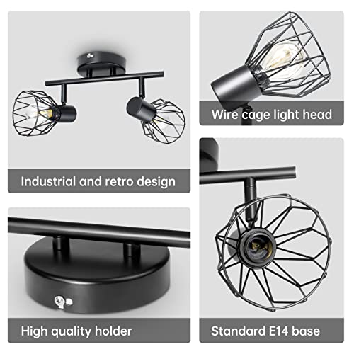 Dehobo Faretto Led Interno da Soffitto Nero, Lampada Vintage Industriale E14, Luci da Soffitto per 2 Lampadine E14 non Incluse, Faretti da Parete Orientabili per Soggiorno Camera da Letto, Max 40W