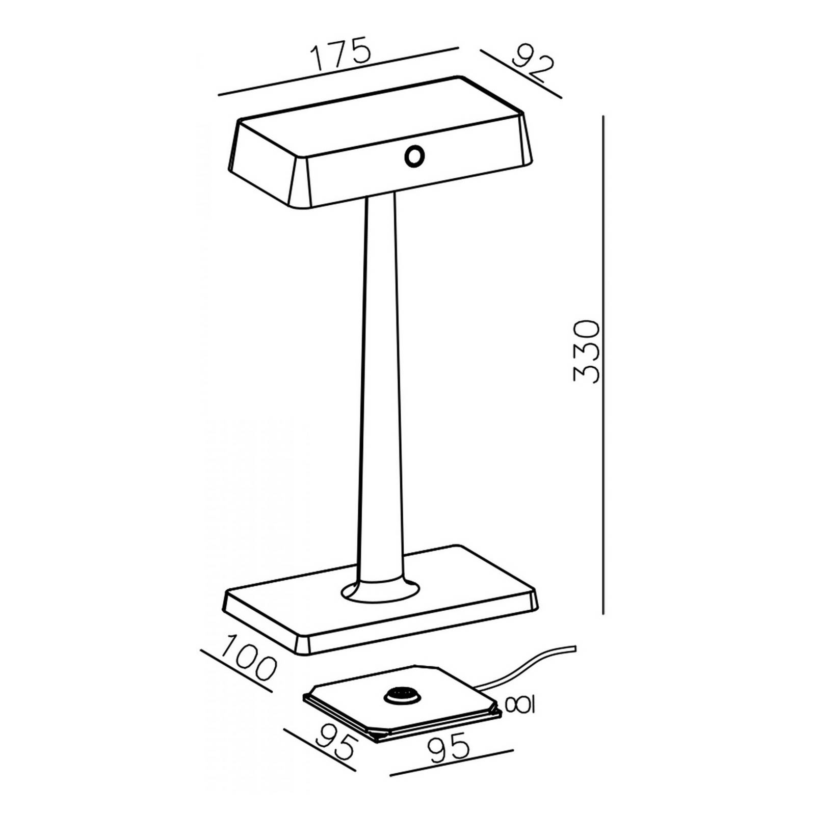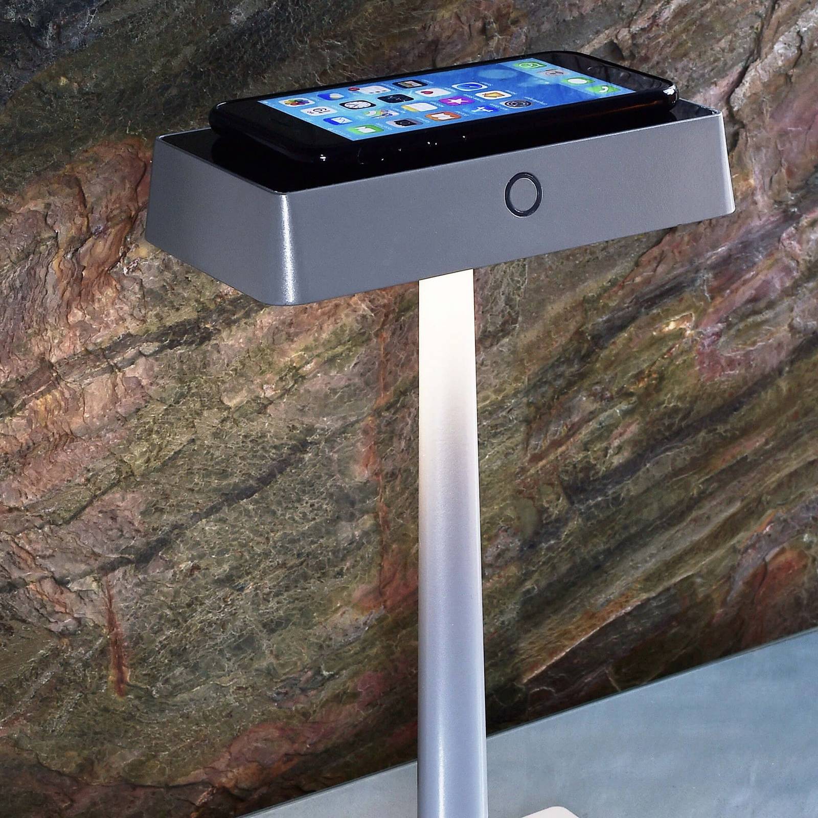 Lampada da tavolo a LED a batteria Algieba con pannello di ricarica per smartphone, può essere utilizzato all'interno e all'esterno La moderna lampada da tavolo a LED Algieba convince su tutta la linea. Può essere utilizzato in modo flessibile, sia all'interno che all'esterno sulla terrazza o sul balcone. Grazie alla batteria integrata, che ha un'autonomia di circa 10 ore, può essere collocato ovunque. La ricarica è un gioco da ragazzi con la base di ricarica in dotazione. La luce dei LED integrati, di colore bianco caldo, può anche essere dimmerata continuamente con un interruttore a sfioramento. Super pratica è la ricarica wireless del proprio smartphone sulla parte superiore del paralume. La funzione di ricarica può essere attivata e disattivata opzionalmente tramite un interruttore.