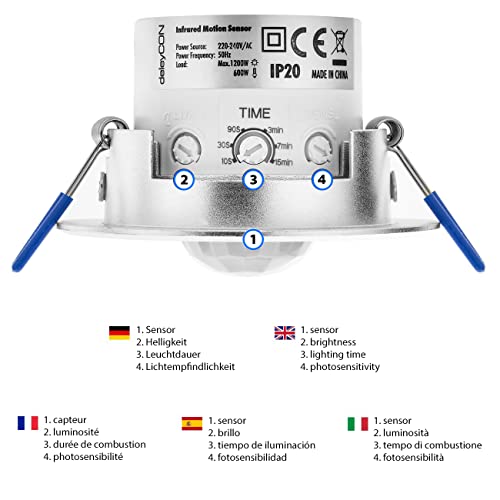 DeleyCON 1x Infrarossi Rilevatore di Movimento a Soffitto All'interno - Portata 8m a 360° Luminosità Ambientale Regolabile IP20 da Incasso Alluminio