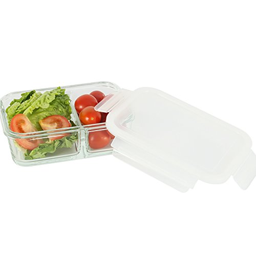 Contenitore in vetro sono realizzati in vetro borosilicato da alta, contenitore in vetro è forno a microonde, forno, lavabile in lavastoviglie, freezer. Resistente al calore da -40 - 450 C. Una base 900 ml, 900 ml e un altro scomparto con due. Sia con coperchio a chiusura ermetica in plastica PP, senza BPA e LFGB approvato.