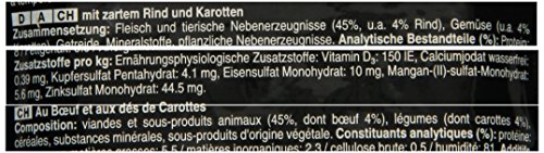 Carni e derivati (45%, di cui 4% manzo). Ortaggi (di cui 4% carote.) Cereali. Sostanze minerali. Sottoprodotti di origine vegetale