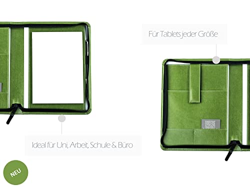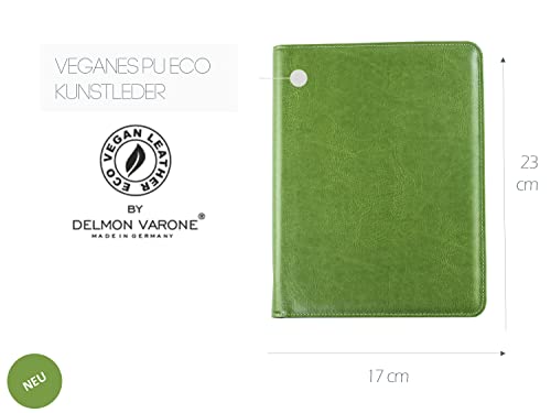 DELMON VARONE - Cartellina per tablet con chiusura lampo, blocco note DIN A5 (50 fogli) in ecopelle vegana, colore: verde