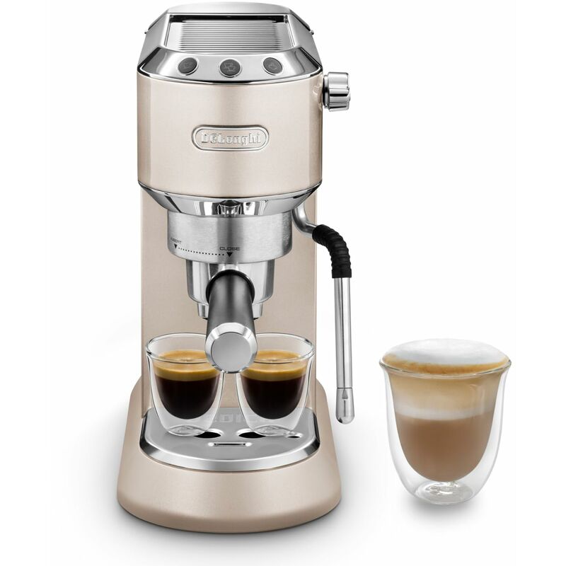 Macchina manuale da caffè espresso, pressione 15 bar, Thermoblock, Flow Stop, comandi elettronici, nuovo sistemo montatura latte MyLatte Art per garantire una texture ideale a tutte le bevande latte, dimensioni compatte (14,9 cm), nuovo filtro con capacità 16g disponibile anche per cialde E.S.E, nuovo raccogli gocce regolabile in altezza per tazze fino a 13 cm, serbatoio estraibile 1 lt, filtro dell'acqua opzionale, scaldatazze passivo. Colore beige
