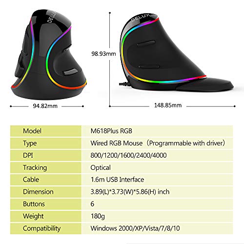DeLux Mouse Verticale Cablato, Mouse Verticale con Illuminazione LED RGB, 800-4000 DPI, 6 Pulsanti, Con Poggiapolsi per Alleviare la Pressione Sulle Mani, per PC, Computer, Portatile, Mac