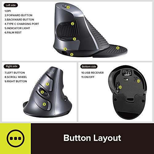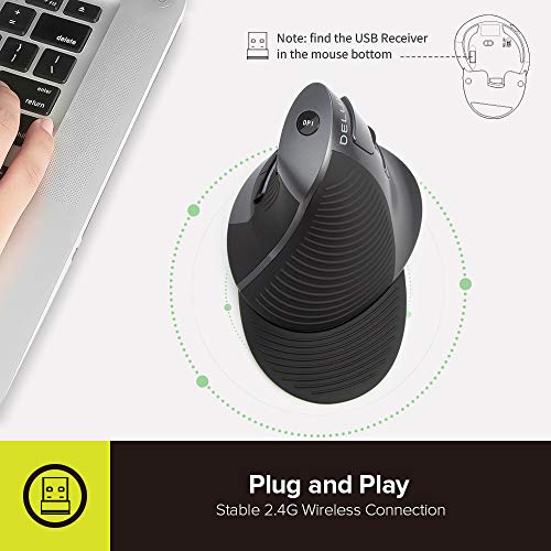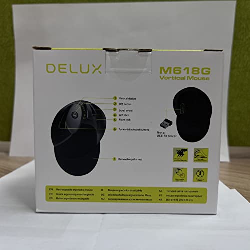 DeLUX Mouse Verticale Wireless, Mouse Ergonomico Ricaricabile, Silenzioso Mouse per il Tunnel Carpale, 3 DPI Regolabile (800/1200/1600), USB, Poggiapolsi Rimovibile, 6 Pulsanti (618G GX)