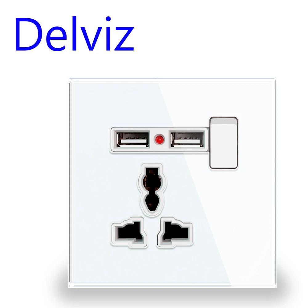 Delviz Universal USB Socket, 2.1A Dual USB Charger speedy Port, LED indicator, Tempered glass Panel, EU Wall 3 Hole Power Socket