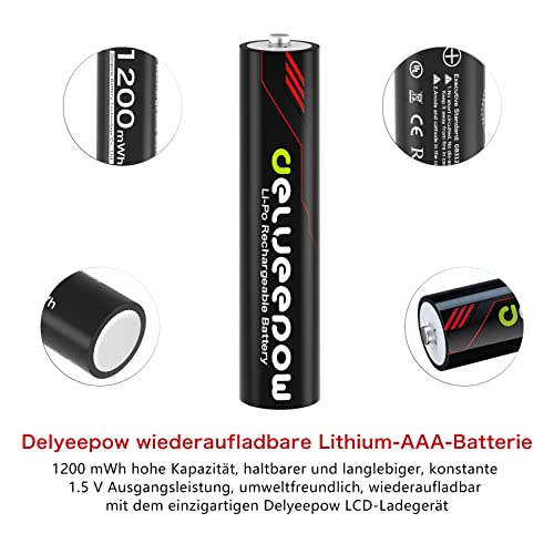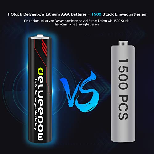 Delyeepow Batteria Ricaricabile AAA Litio 1.5V 1200mWh, Pile Ricaricabili AAA Lithium ad Alta Capacità da 1500 Cicli, Confezione da 4