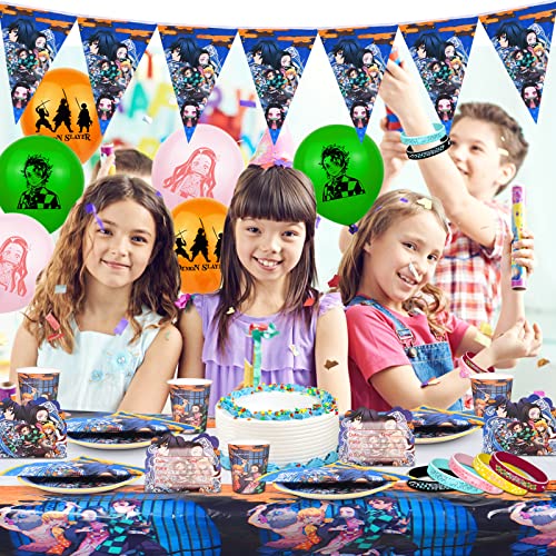 Kit Demon Slayer Compleanno, Demon Slayer Stoviglie di Compleanno Set, Set di Articoli per Feste Piatti per Feste Tazze Tovaglioli Tovaglia e Palloncini Addobbi 74Pezzi