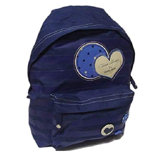Denny Rose Dots&Stripe Zaino Americano, in resistente tessuto foderato internamente in fantasia a pois blu e nero, ampia tasca con zip nella parte anteriore dello zaino, tasca interna con zip all'interno dello zaino, schienale imbottito, spallacci imbottiti, scritta denny rose su cuore in ecopelle cucito, spillene nella tasca anteriore.