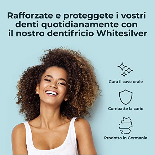 Tutto in uno: il dentifricio Whitesilver previene efficacemente la carie, riduce la formazione di placca, rinforza e rimineralizza lo smalto dei denti, si prende cura delle gengive e protegge dal tartaro + rimuove lo scolorimento per uno sbiancamento naturale dei denti.