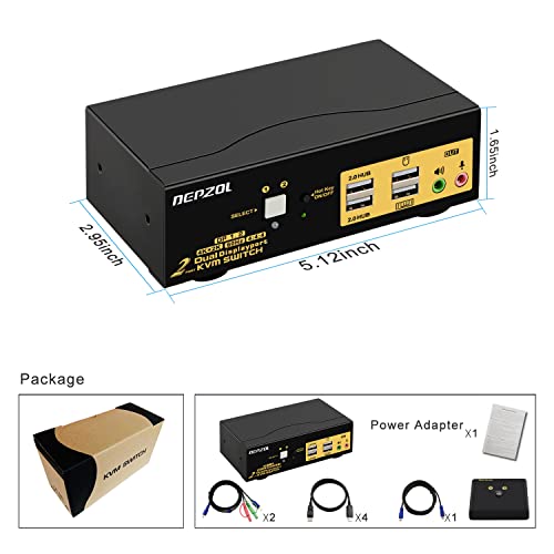 DEPZOL Switch KVM a 2 porte DisplayPort doppio monitor 4096x2160 a 60Hz,fer computer DP Computer portatili 2 ingressi 2 uscite con audio e supporto USB 2.0 HUB DP 1.2 (622DP)