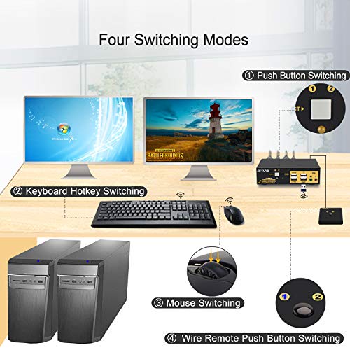 【INTERRUTTORE KVM A DOPPIO MONITOR CON MODALITÀ DI COMMUTAZIONE AVANZATE】 Fornisce diverse opzioni di commutazione per soddisfare diversi scenari: 1. Tasti di scelta rapida da tastiera. 2 Clic del mouse. 3 Pulsante di commutazione. 4 Telecomando cablato. 5. Scansione automatica con intervallo di tempo regolabile tra 8-999 secondi (per il monitoraggio di più computer / DVR / NVR
