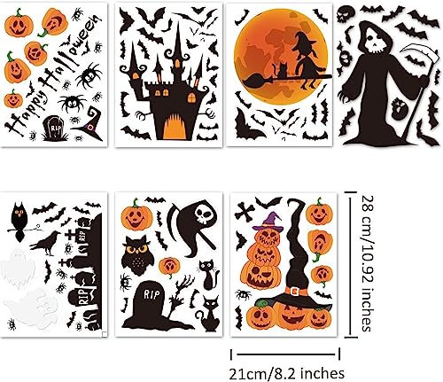 DERAYEE 7 Fogli Adesivi per Finestre Halloween,109 pezzi Vetrofania Halloween Zucca Teschio Fantasma,Decorazione per Feste di Halloween