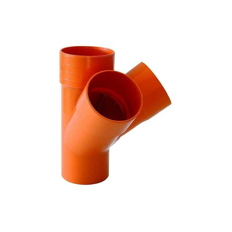 La derivazione o braga a scagno a 45° ad angolazione doppia in PVC è prodotta in materiale plastico e destinata al trasporto di fluidi, con giunzione mediante incollaggio. Questa derivazione è definita doppia in quanto collega tre linee di tubazione, dello stesso diametro. L'assemblaggio avviene tramite prodotti per incollare e collegare: mastice e colla saldante. Disponibile solo in colore arancio e rientra nella categoria dei pezzi speciali in quanto realizzata artigianalmente con saldatura termoplastica . I diametri disponibili possono essere selezionati tramite il menù a tendina.