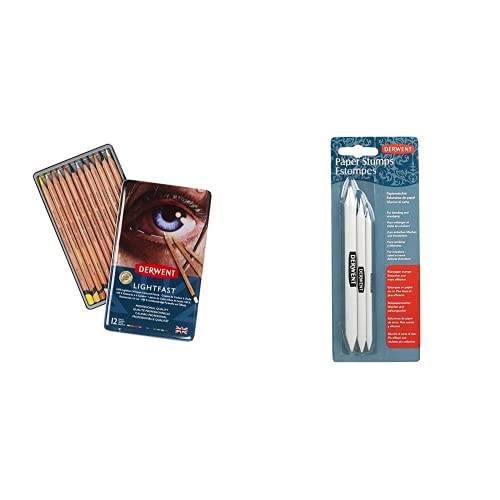 Derwent Lightfast Set di 12 Matite Colorate per Disegnare e Colorare, Resistenti alla Luce & Set di 3 Sfumini in Carta di Riso, per Sfumare ed Attenuare i Colori, Qualità Professionale