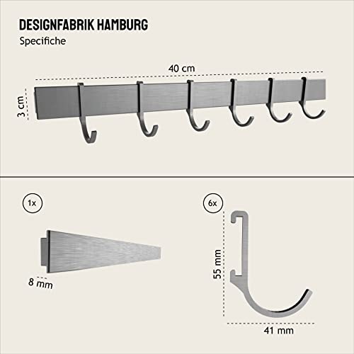 Design Amburgo Porta Utensili Cucina da Parete, Autoadesivo, Porta Mestoli, Porta Asciugamani, Portamestolo | Ganci Cucina Senza Buchi | 6 Ganci Semoventi | 40cm | Grigio Argento Apazzolato