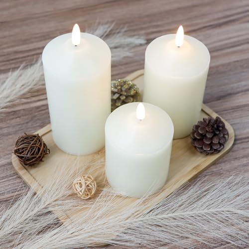 JHY DESIGN 3D Candele Senza Fiamma Set di 3 Pilastri a Batteria in Vera Cera Candela LED Tremolante con Timer Telecomando a 8 Tasti per Tavolo da Regalo in Casa per Feste di Nozze (12/15/18 cm)