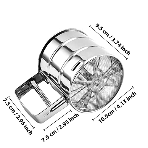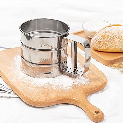 Grande capacità: con il design con grande capacità è possibile estrarre 250 grammi di farina contemporaneamente, riducendo il numero di tempi di setacciatura e risparmiare tempo ed energia. Il setaccio per farina in acciaio inox con una mano è abbastanza grande per evitare che la farina fuoriesca dall'alto come un filtro a manovella. È facile e comodo da trasportare.