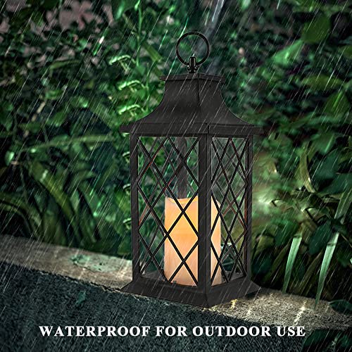 【LANTERNA DECORATIVA】 La lanterna da soggiorno vintage a grandezza naturale con candela LED alimentata a batteria, con lastre di vetro, griglie a croce, composta da rete nera di alta qualità e anelli di metallo, aggiunge un tocco meraviglioso a qualsiasi spazio con il grazioso connubio di bellezza e praticità - Puntello accattivante per appendere, bar, patii, portici;