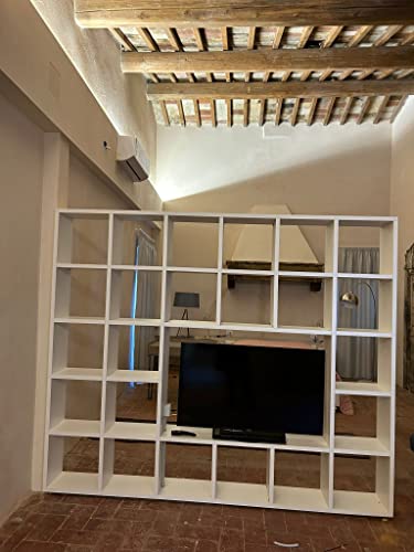 Mar.c.a. Design -Libreria bianco frassinato con porta TV in legno melaminico finitura bianco frassinato cm L. 261 P. 30 H. 218 Misura vano TV cm L. 126 H. 83 Misura interno cubo cm 40 x 40
