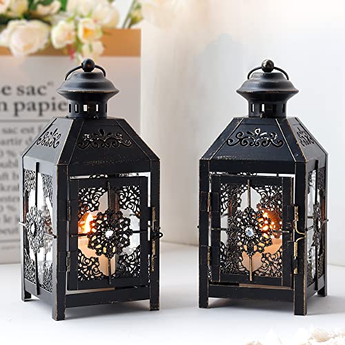 JHY DESIGN Set di 2 Metallo Lanterne Decorative 24 cm di Altezza Stile Vintage Appeso Lanterna Vento Luce Decorazione Lanterne Portacandele per Interni Matrimoni Regalo (Nero con Pennello Dorato)