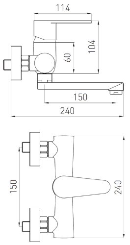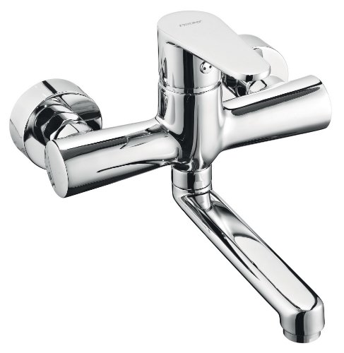 Molto elegante rubinetto miscelatore per montaggio a parete con erogatore orientabile corto.